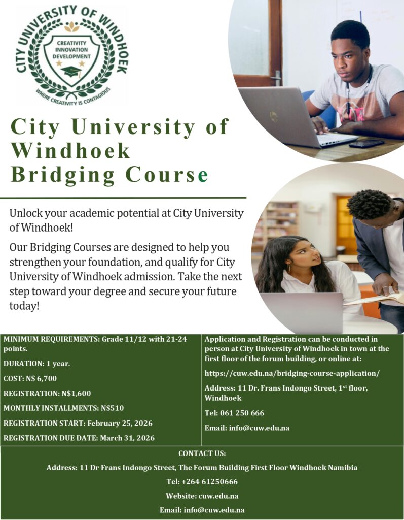 Our Bridging Course at City University of Windhoek is designed for students with 21–24 points in Grade 11 or 12 who want to strengthen their foundation and qualify for degree studies at City University of Windhoek.